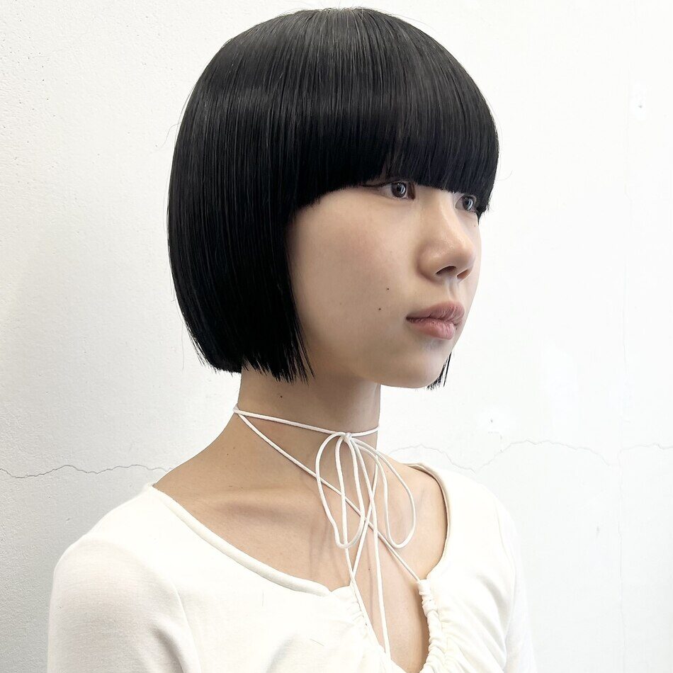 ぱつっとした重めのカットラインと、一目で印象を引くエッジの効いたホットピンクのデザインカラー